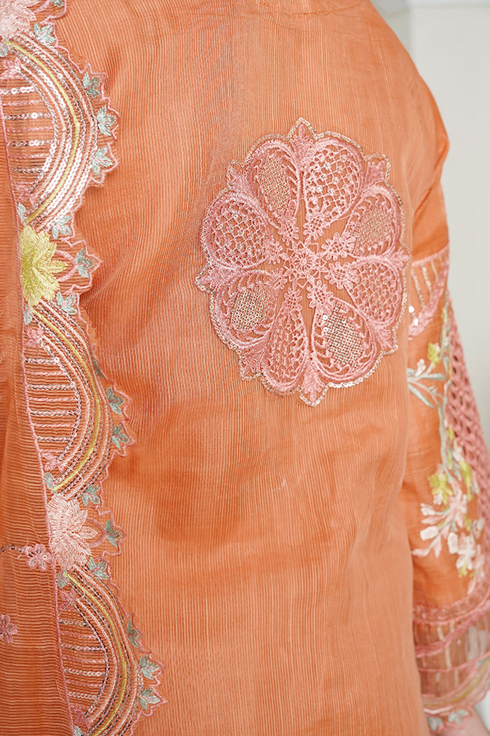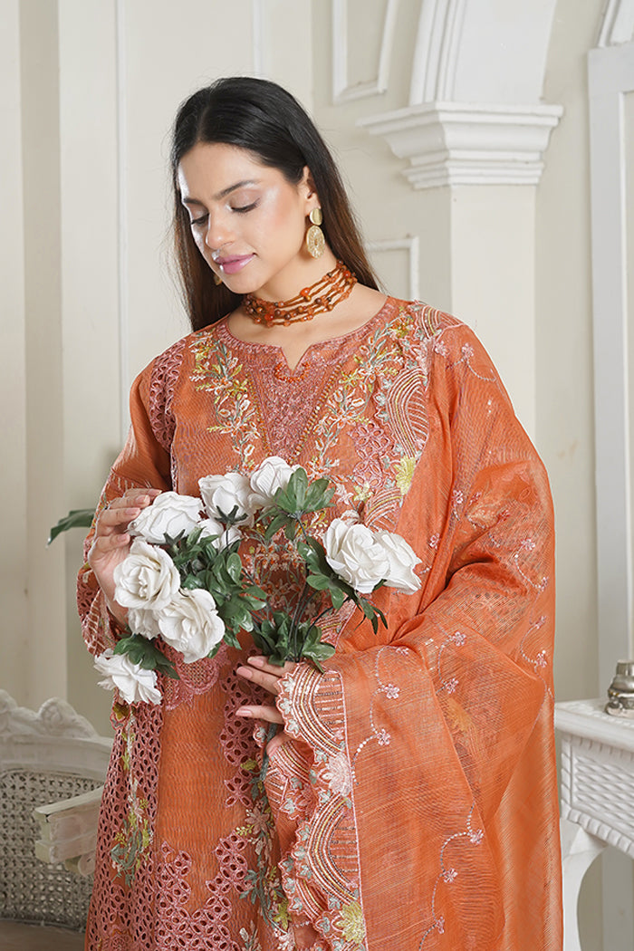 A Stunning Burnt Copper Knitted Viscose Shirt Beautifully Adorned With Heavy Boring Embroidery And Intricate Floral Patterns. The Embellished Neckline Features Delicate Cutdana Work, While The Sleeves Are Enhanced With Cutwork And An Elegant Organza Border. Paired With Matching Embroidered Trousers Finished With Floral Lace, And A Coordinated Embroidered Dupatta With Graceful Floral Detailing For A Complete Luxe Look.