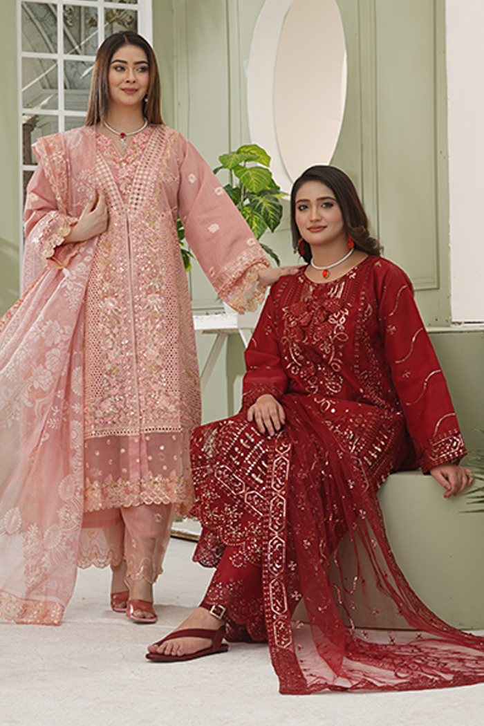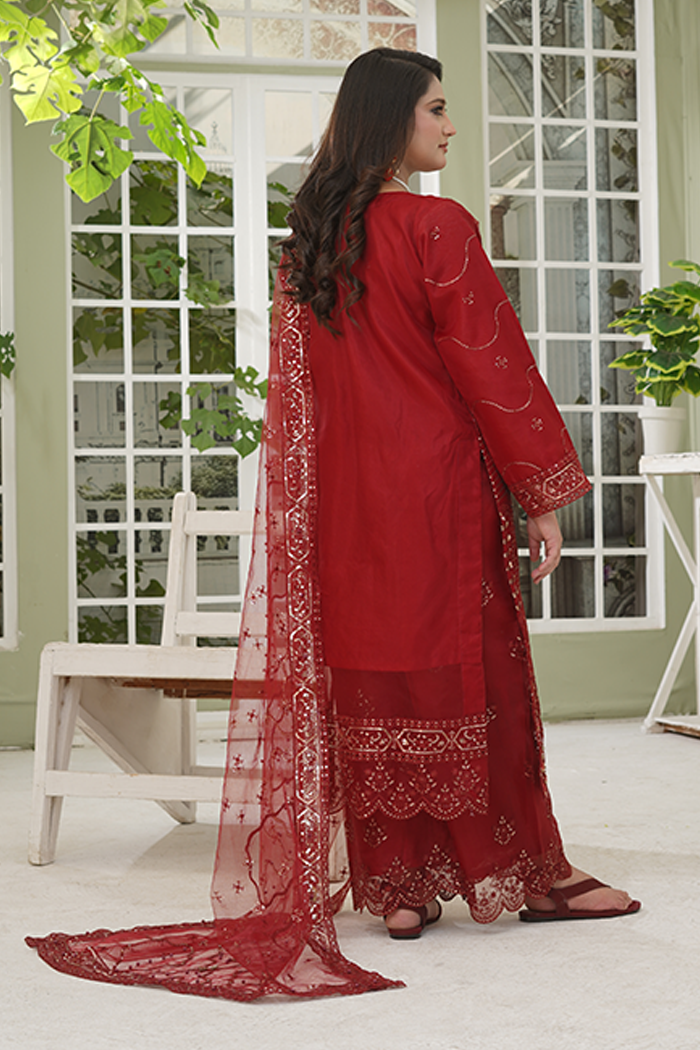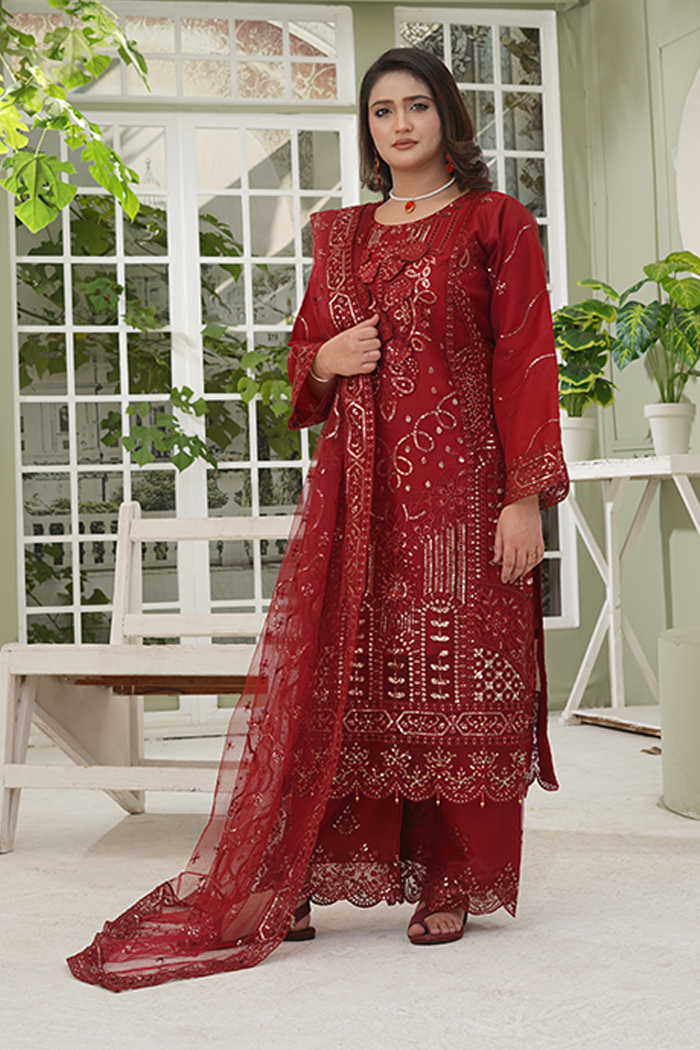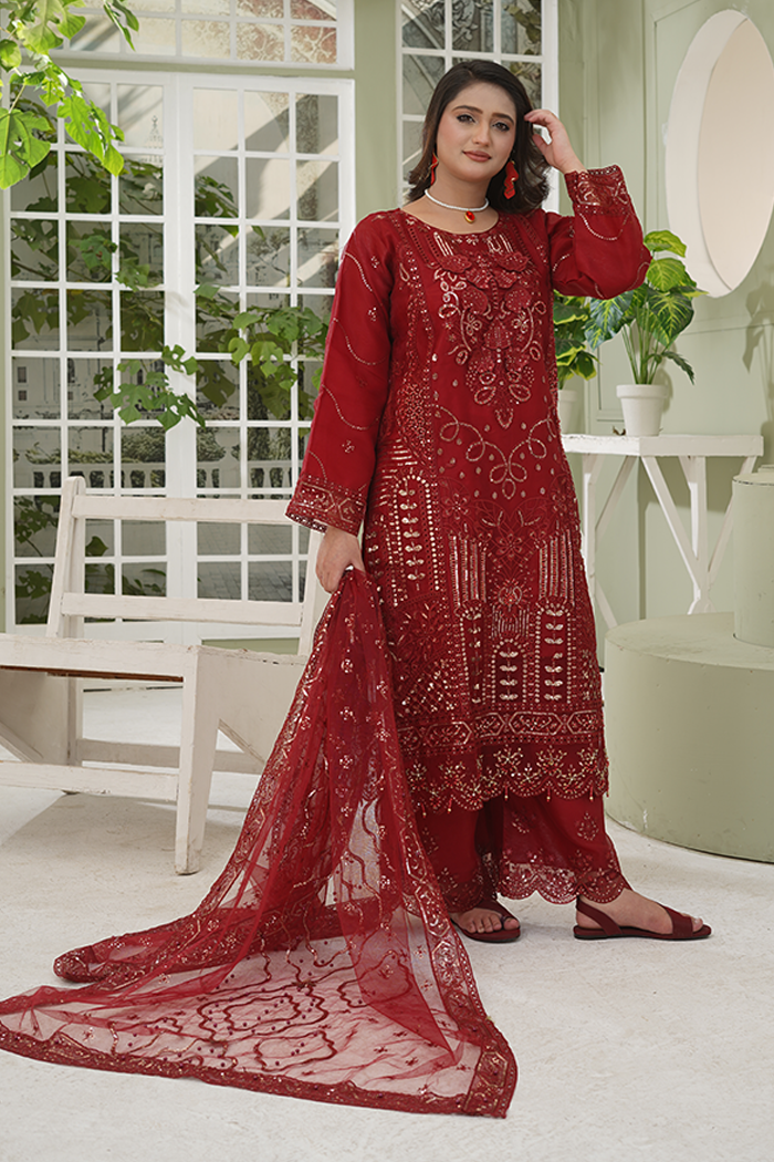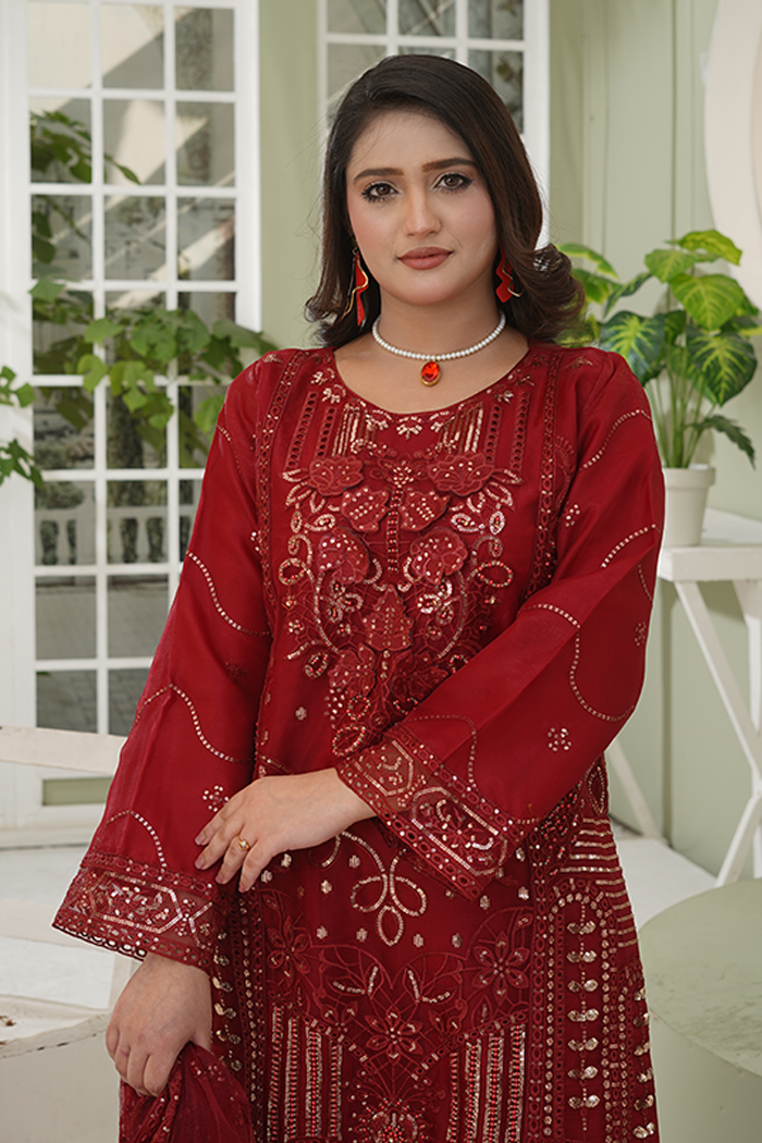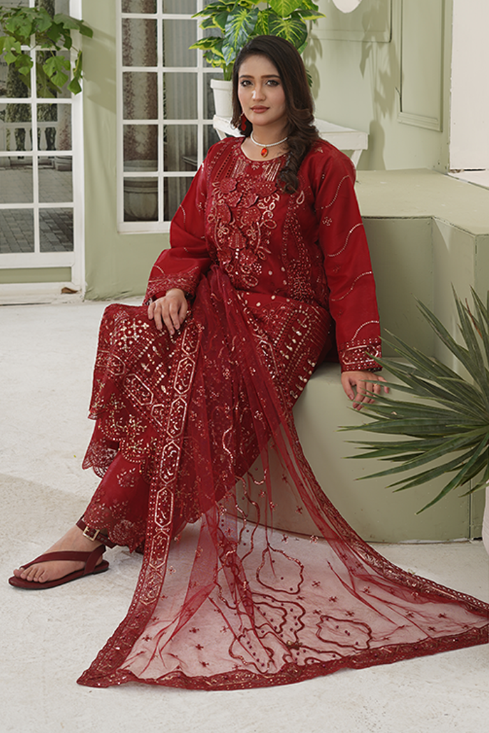 A captivating deep red ensemble that radiates festive elegance. The shirt is adorned with exquisite thread and zari embroidery, enhanced by delicate mirrorwork and lace accents. The richly embroidered net dupatta adds a graceful finish, while the matching trouser completes this timeless, statement look perfect for formal gatherings or festive celebrations.
