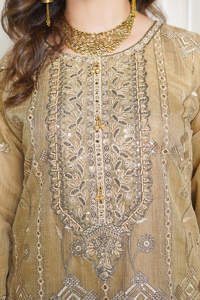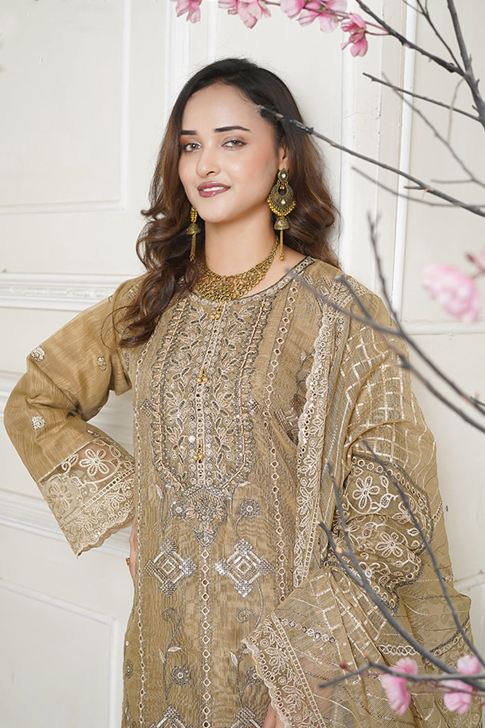 Embroidered Mustard Brown Net Slub 3 Piece Pret