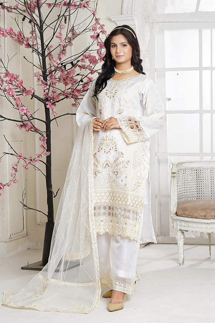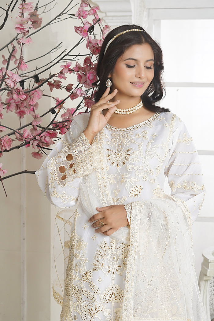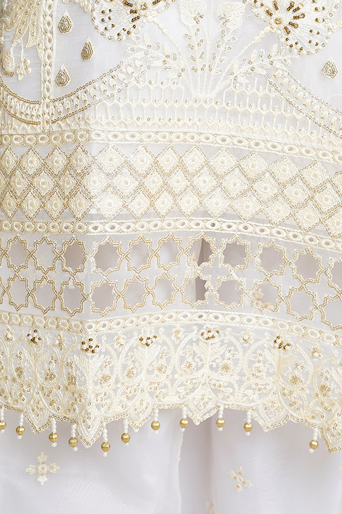 An Elegant Off-White Organza Shirt Adorned With Intricate Crystal And Sequin Embellishments. The Design Is Complemented With Embroidered Sleeves Featuring Delicate Lace Detailing. Paired With An Embroidered Organza Palazzo And A Matching Breezy Net Dupatta, Finished With A Refined Organza Border For A Graceful Look.