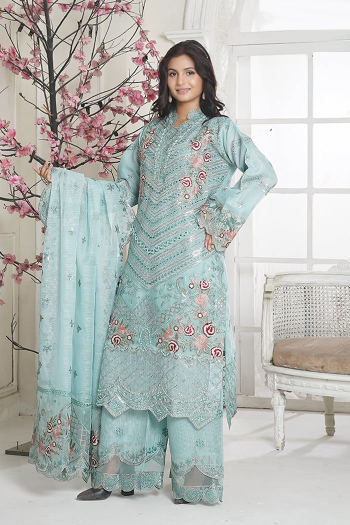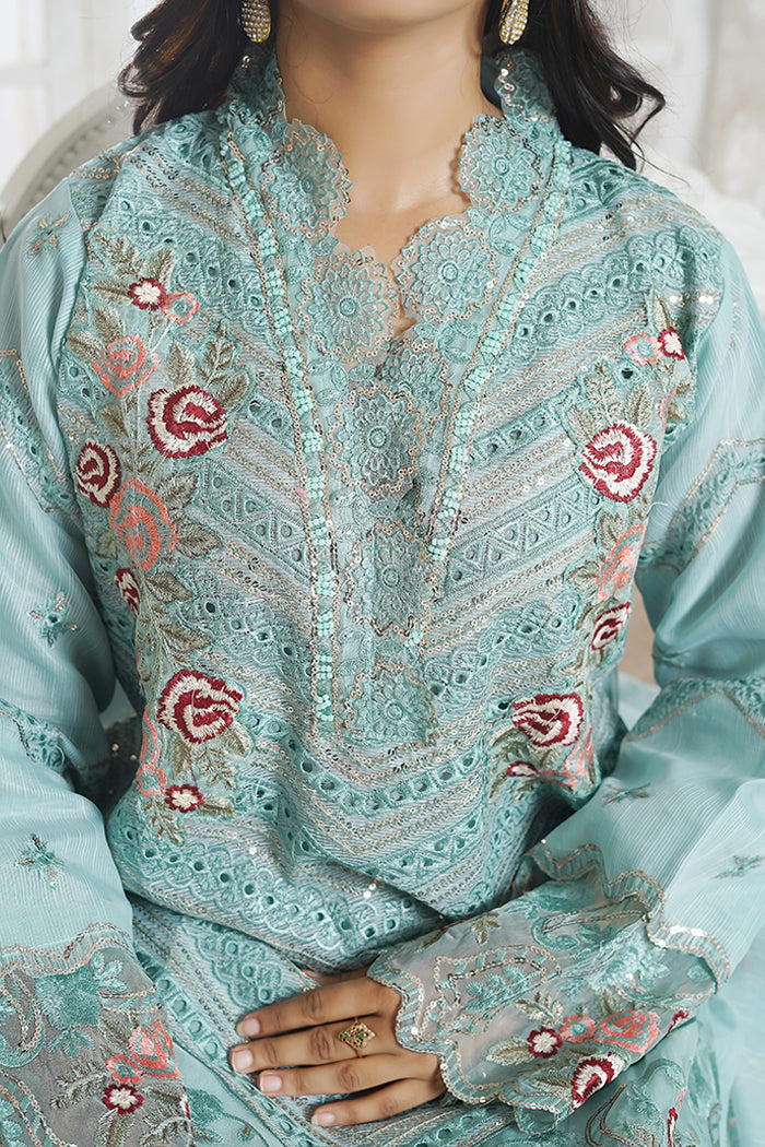 Pastel Aqua Ivory Slub Shirt Adorned With Heavy Geometric And Floral Embroidery. The Look Is Completed With Embroidered Sleeves Featuring Lace Detailing, Paired With Matching Embroidered Straight Trousers. The Ensemble Is Finished With An Ivory Slub Embroidered Dupatta Enhanced With Organza Pallu Finishing For An Elegant Touch.