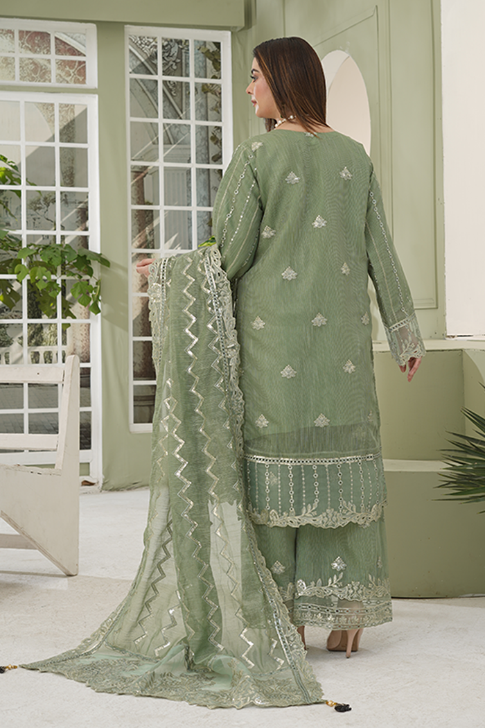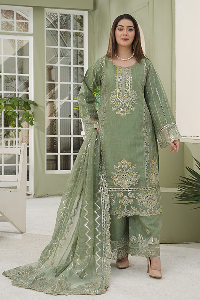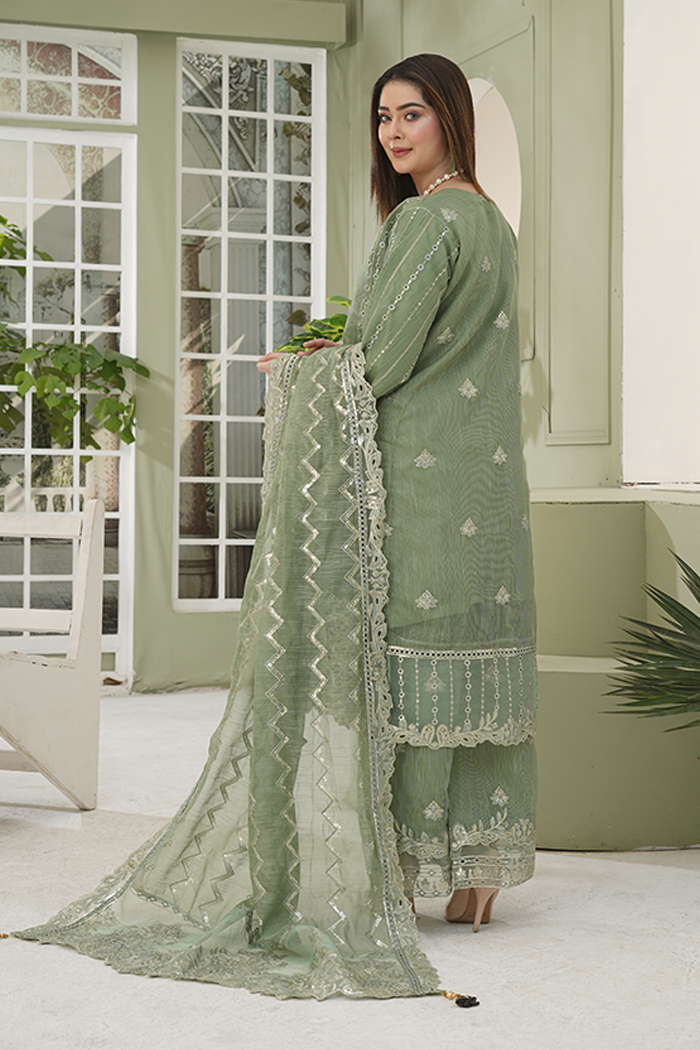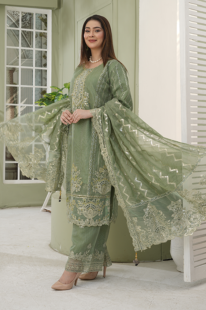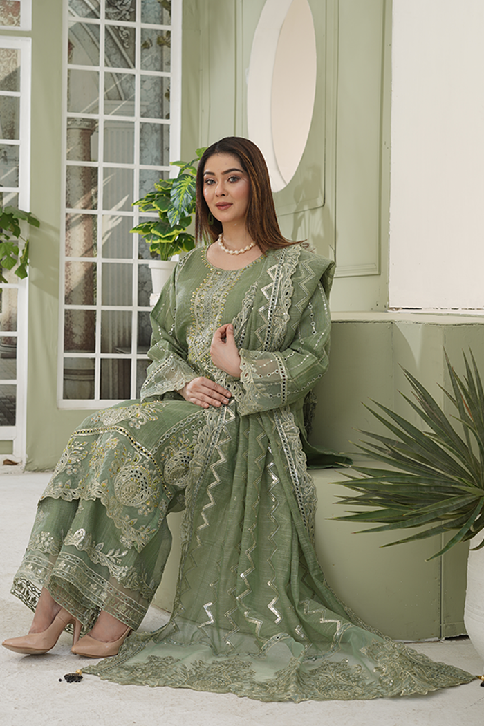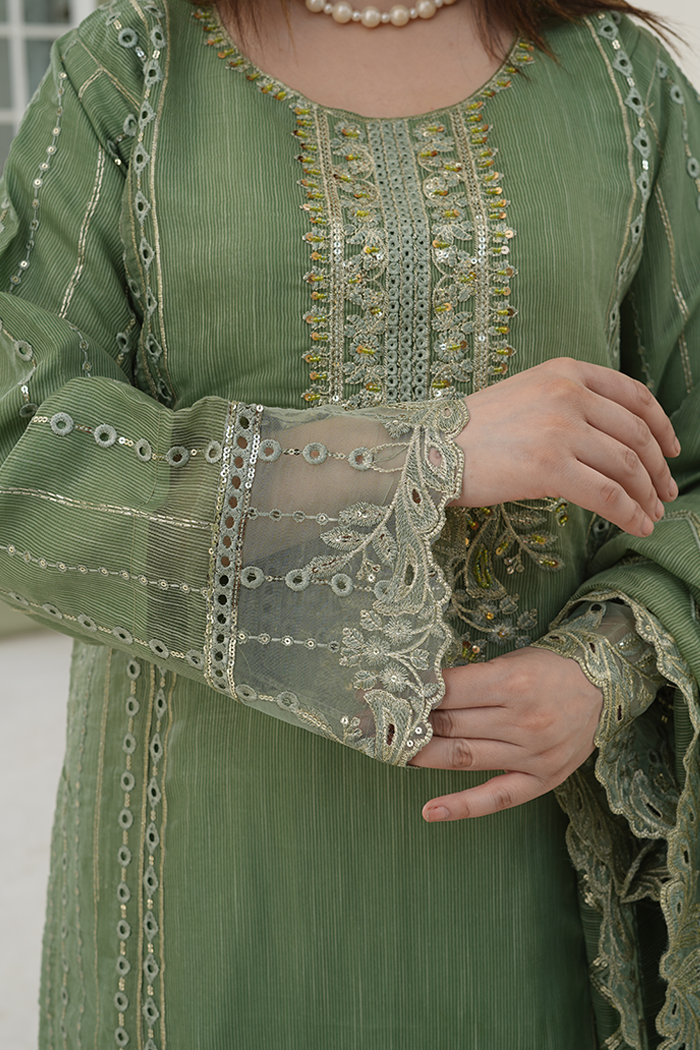 An elegant olive-green outfit featuring delicate thread and zari embroidery with subtle mirror accents. The beautifully crafted shirt pairs perfectly with a matching embroidered dupatta and straight trousers, creating a timeless and sophisticated look for any occasion.