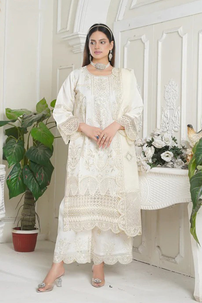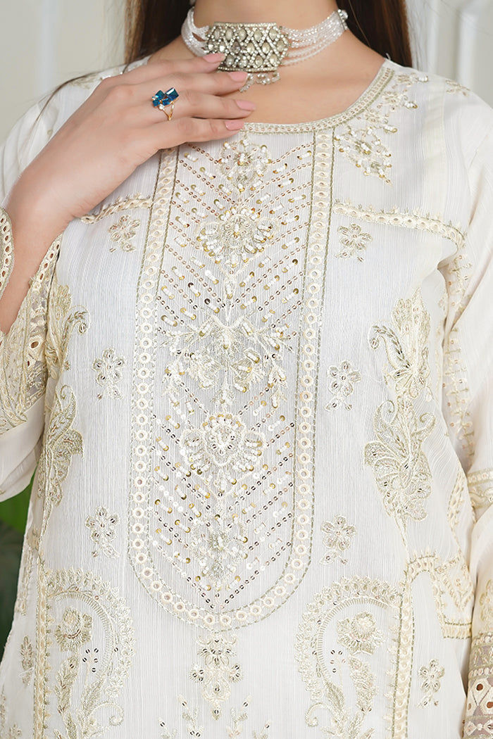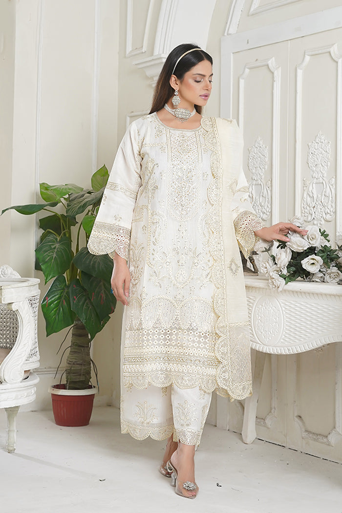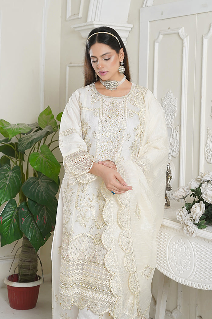 An Elegant Pearl White Gloria Slub Shirt Enriched With Golden Embroidery And Finished With Delicate Cutwork Borders. The Embroidered Sleeves Feature Refined Cutwork And Intricate Hem Patterns. Paired With Embroidered Trousers Enhanced With Lace Finishing, And A Coordinated Pearl White Gloria Slub Dupatta Adorned With Embroidered Borders, This Ensemble Exudes Timeless Sophistication.