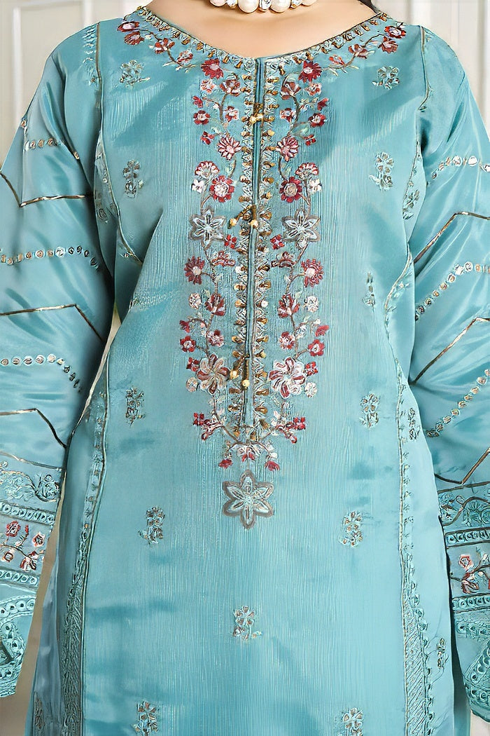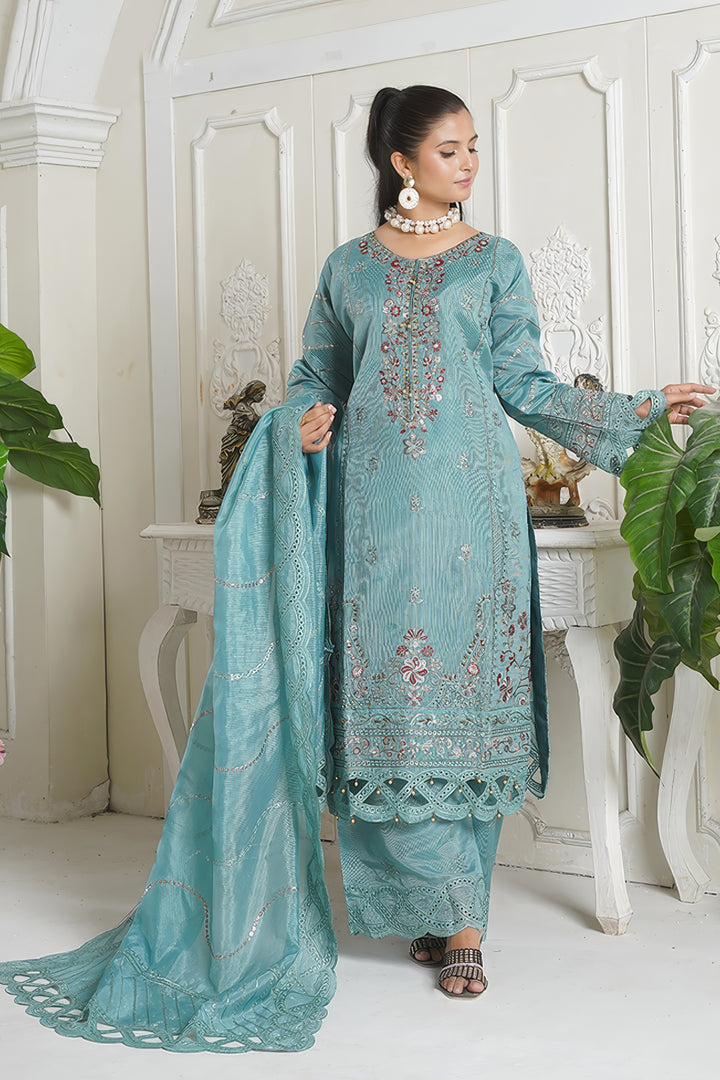 An elegant teal blue khadi net shirt featuring intricate laser cutwork and boring embroidery on the daman. The embroidered sleeves are highlighted with a refined cutwork border. Paired with coordinated trousers finished with lace detailing, and a flowing khadi net dupatta adorned with delicate embroidery and scalloped edges for a graceful finish.