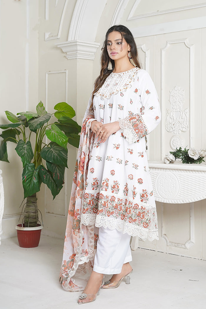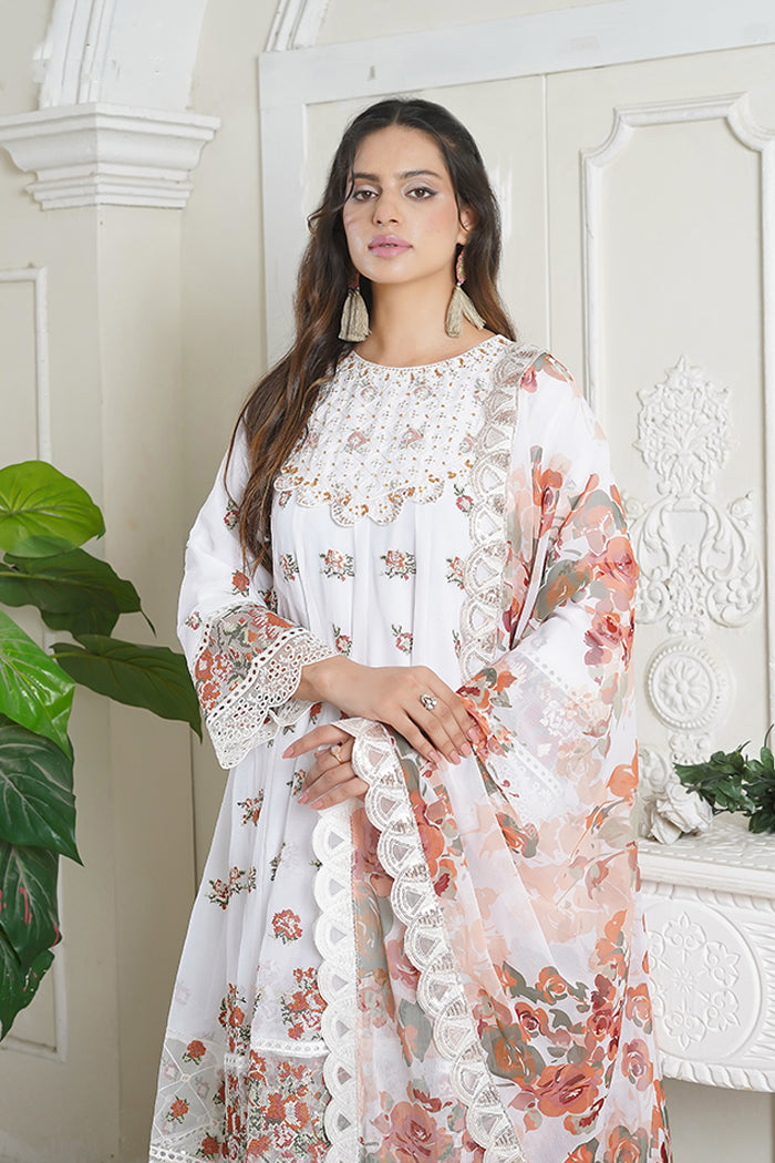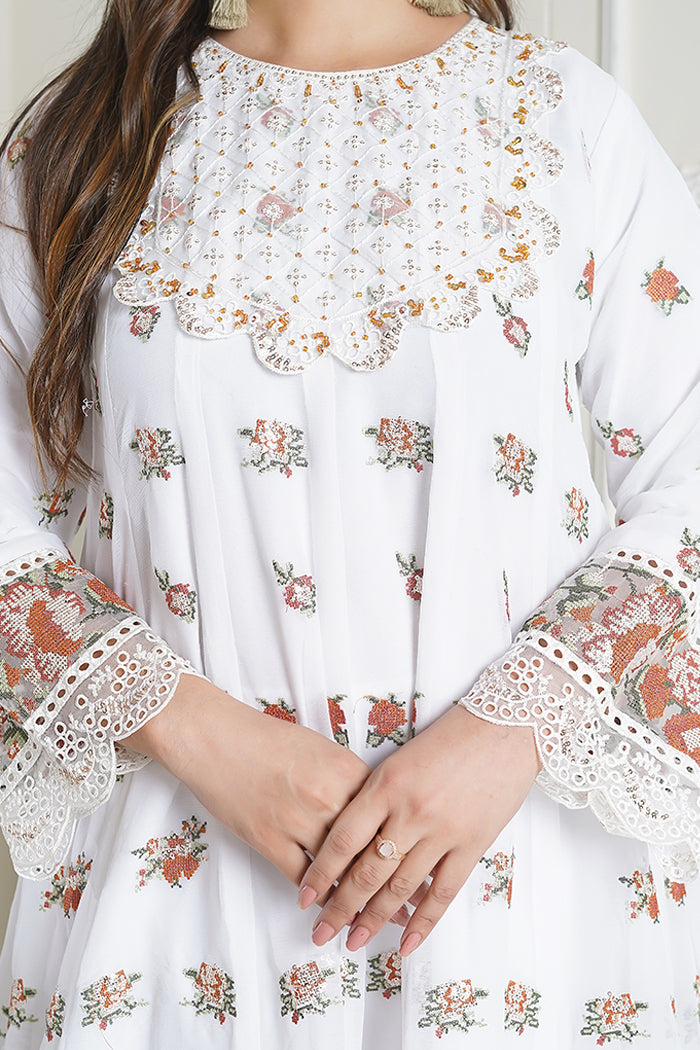 Elegant White Chiffon Frok With Cros Stitched Embroidered Flowers